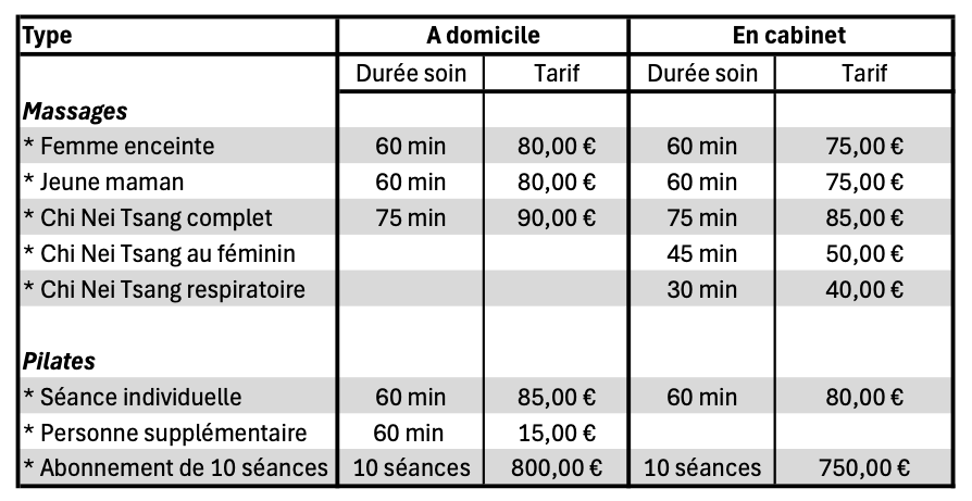| Douleurs liées à la grossesse | 60 min | 80 eur | 60 min | 75 eur |